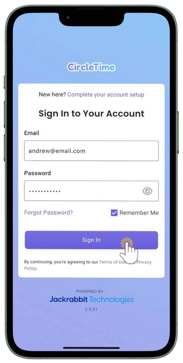 A family can download the app after they register a child and tap Complete your account setup, or an Owner or Administrator can Invite Parents and Contacts to Download the CircleTime Mobile App. The parent/contact enters the email address and password they set up for their account before clicking Sign In.